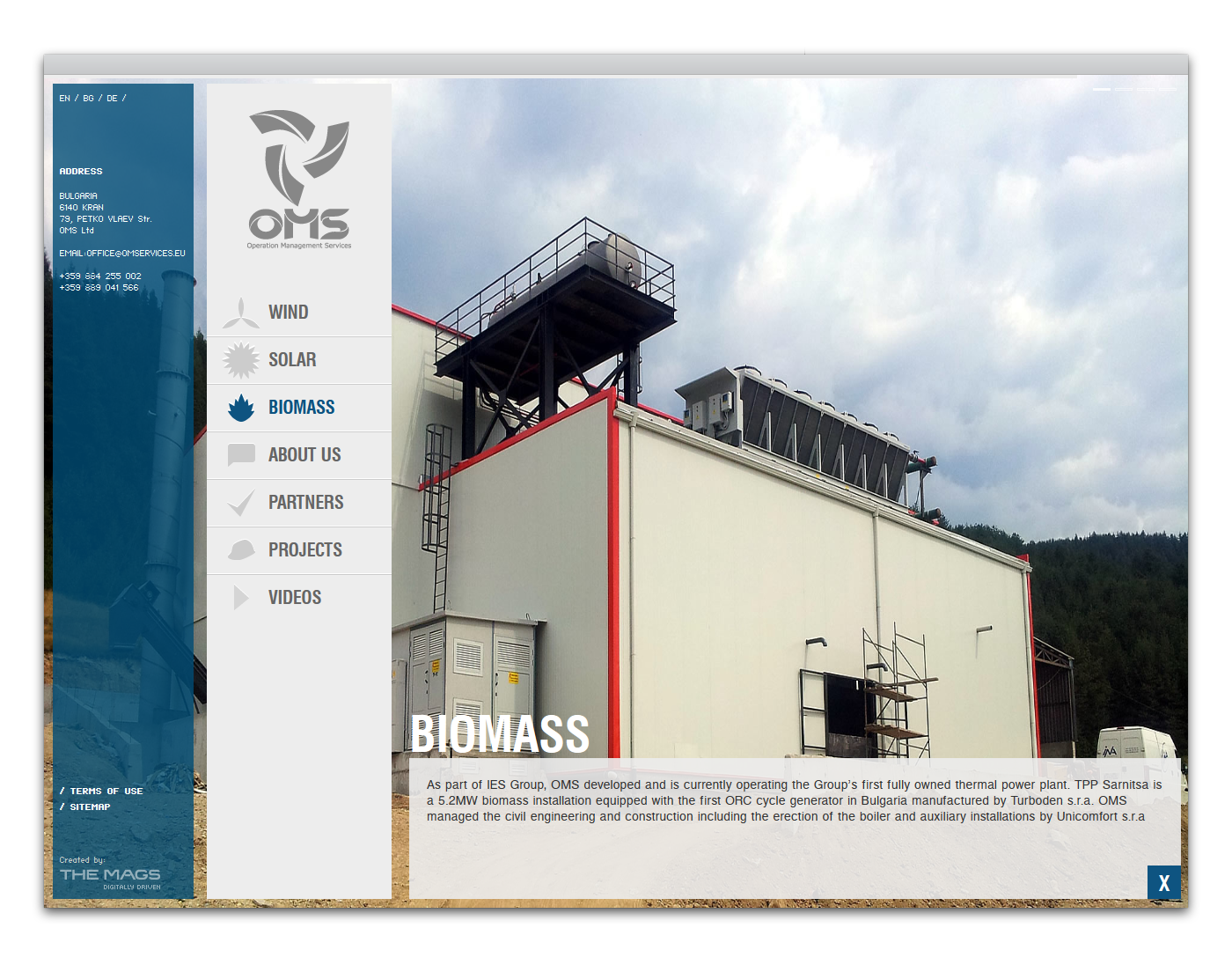 С над десет години опит Operation Management Services е българският лидер в разработването и изграждането на мощности и предоставяне на услуги на пазара за енергия от възобновяеми източници – вятър, слънце, биомаса.Клиентът ни разполагаше със значителен архив от изображения, документирали работата по различни проекти, които следваше да представляват основен акцент на сайта.